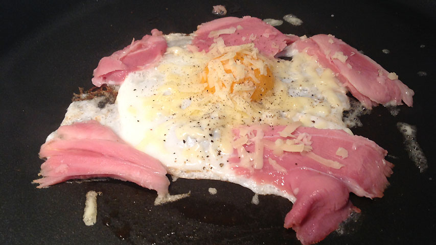 En la misma sartén, con un poco más de mantequilla hacemos el huevo con el jamón cocido y el queso rallado.
