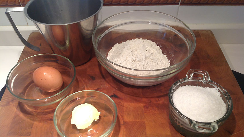Los ingredientes para hacer la galette. Harina de trigo sarraceno, agua, huevo, sal y mantequilla para untar la sartén.