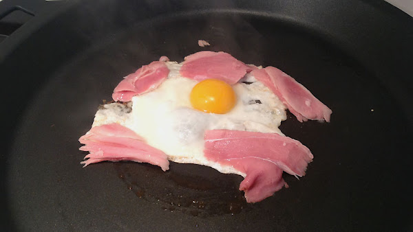 En la misma sartén con un poco más de mantequilla fríe un huevo con jamón cocido y queso al gusto.
