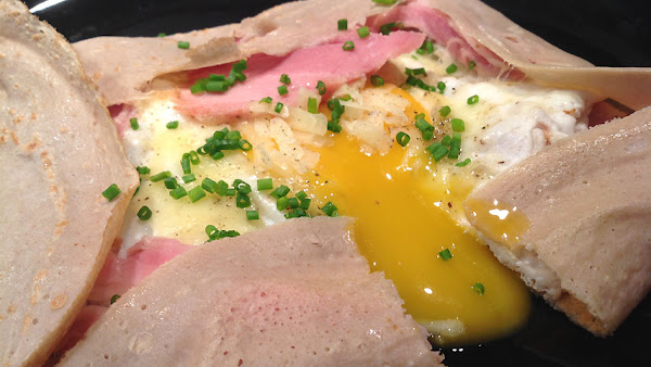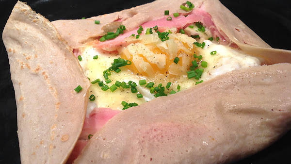 Retira el huevo con el jamón y el queso y colócalo todo sobre la galette. Cierra los extremos de la galette hacia El centro.