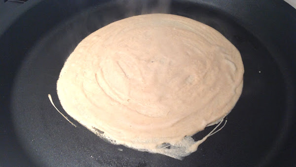 Sartén caliente (yo uso una paella), un poco de mantequilla untada y un cazo de la masa bien estirada para que salga una galette fina.