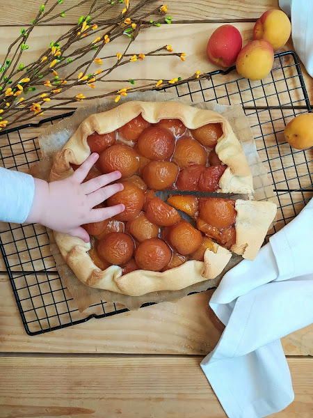Y aqui terminó la sesión de fotos, que salvé la galette de milagro de la hambruna de la benjamina y eso que ella ya había merendado. Que primero me robó los albaricoques y después se lanzó a los de la tarta. ¡Menudo remolino!