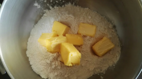 En un recipiente mediano, mezclamos harina, azúcar y sal, y le agregamos la mantequilla en cubos.