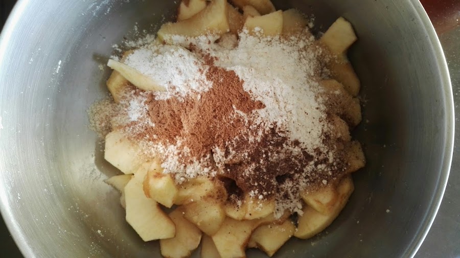 Colocamos todos los ingredientes del relleno en un recipiente y mezclamos suavemente para que no se rompan las manzanas pero que todas queden bien cubiertas.
