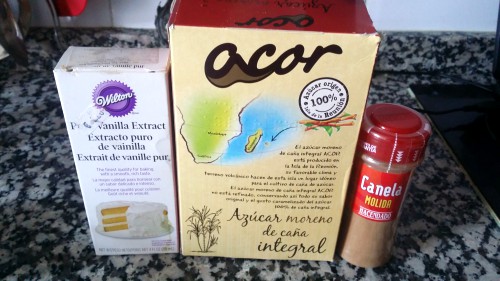 - Las ponemos en un recipiente grande y le añadimos el azúcar moreno, la canela, el extracto de vainilla y el zumo de limón.