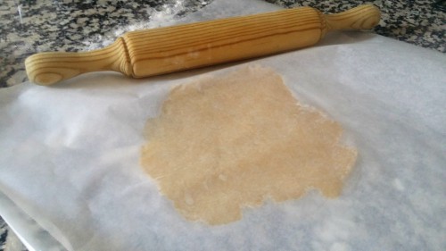 Colocamos cada porción entre 2 papeles de horno y la estiramos. A mí me gusta dejar la masa quebrada muy fina.