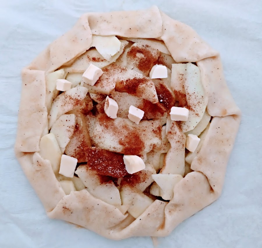 Pincelamos los bordes de la masa con huevo batido y espolvoreamos por los bordes un poco de azúcar y el resto por encima de las manzanas junto con la canela que nos queda.
