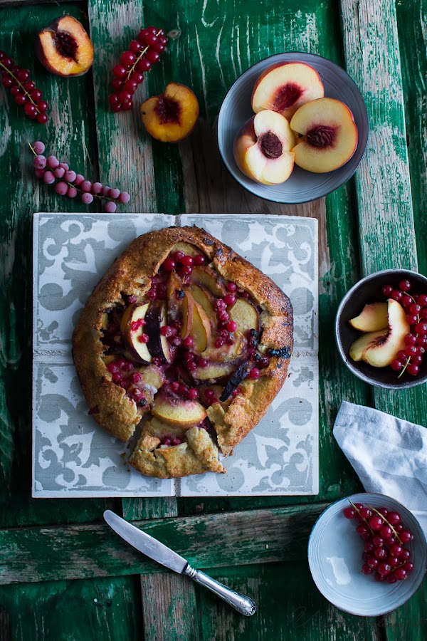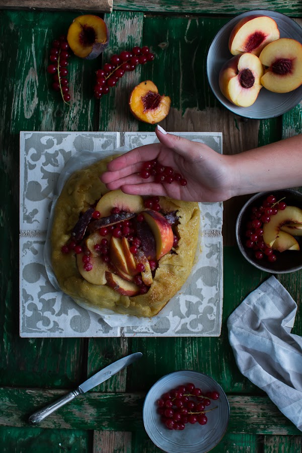 Aviso, si te gustan las frutas ácidas esta galette te va a encantar, aunque se compensa muy bien con el dulzor del melocotón. Pero si lo ácido no es lo tuyo te propongo que pongas solo el melocotón, o que sustituyas las grosellas por frambuesas o fresas.