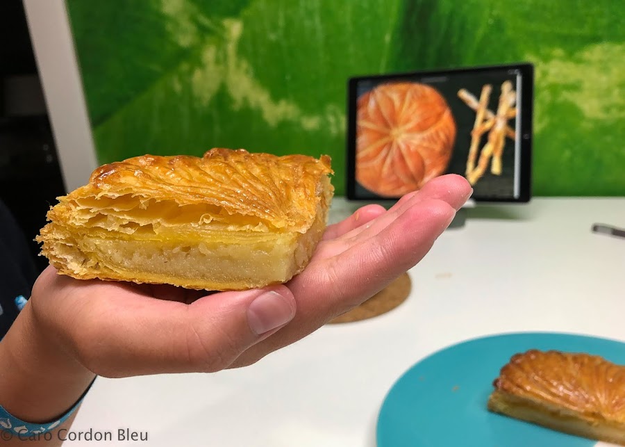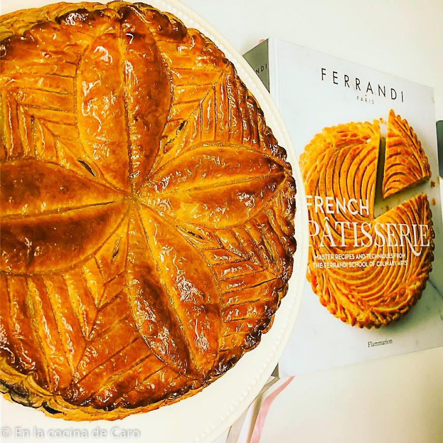 Al día siguiente, estirar el hojaldre en discos de 22 o 23 cm, poner el relleno, pincelar los bordes con agua cubrir con el otro disco de hojaldre, haciendo contacto con la crema. Dar vuelta con cuidado, pincelar con huevo batido y con la parte roma de un cuchillo en diagonal hacer unas pequeñas incisiones para que se unan ambas masas. Enfriar durante 30 minutos, retirar de la nevera, pincelar nuevamente y hacer el dibujo que tengamos ganas o que nos salga jaja.