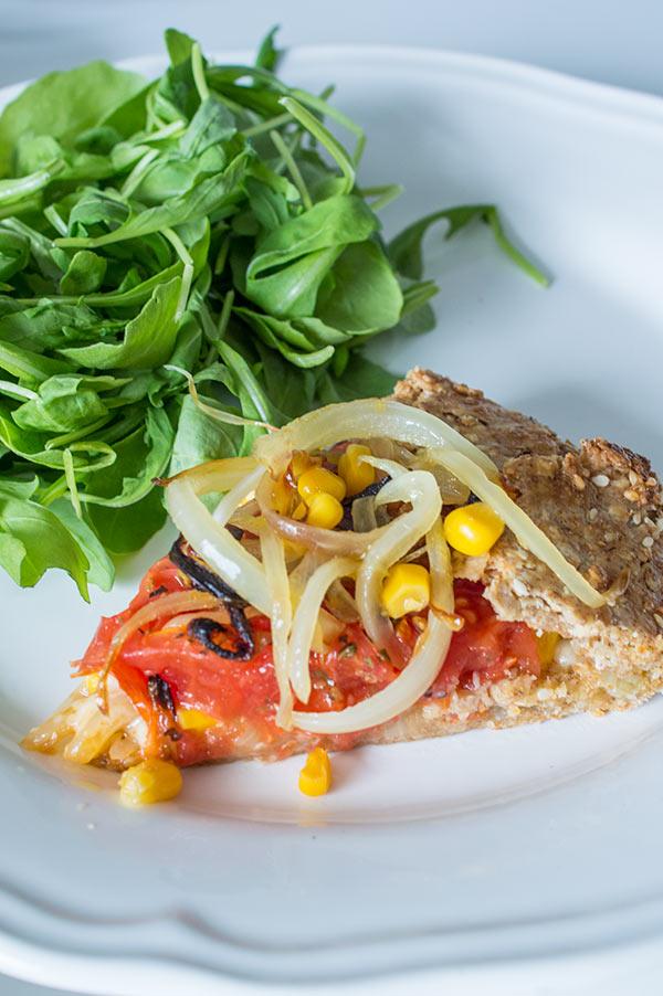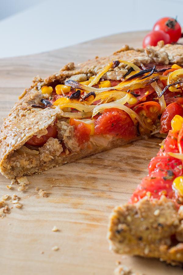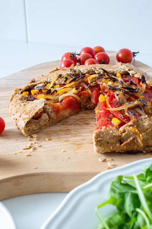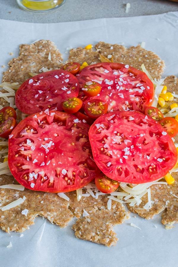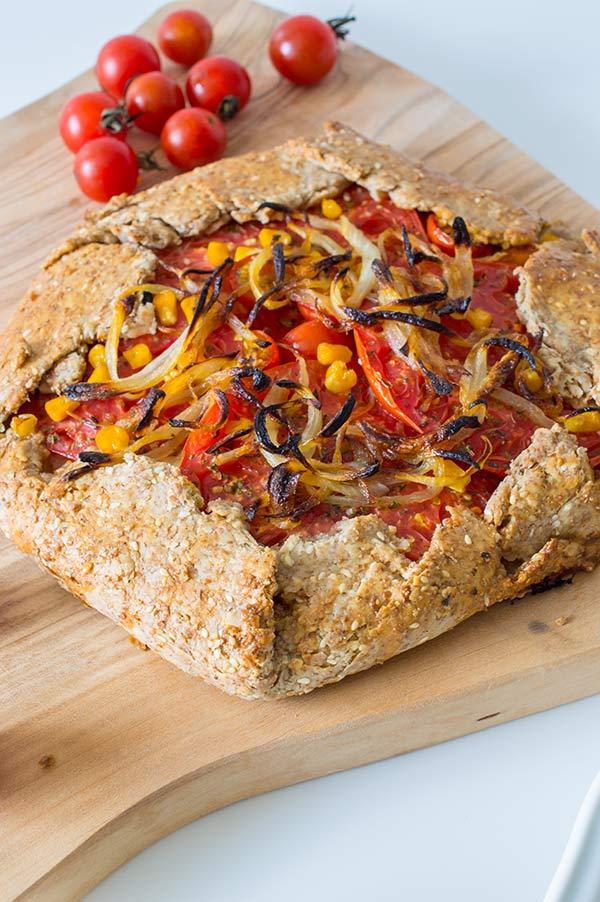 He tenido la suerte de poder usar tomates de huerta, tanto los tomatitos cherry como el delicioso tomate rosa que veis en las imágenes, unos tomates que son todo carne, que maravilla!! Las galettes son una tarta perfecta para rellenar con cualquier cosa, de hecho hace un tiempo hicimos una galette de moras que también esta deliciosa, esta vez he usado una masa un poco mas sana, ya que he usado harina de trigo integral, y aceite de oliva virgen extra, en lugar de harina refinada y mantequilla…