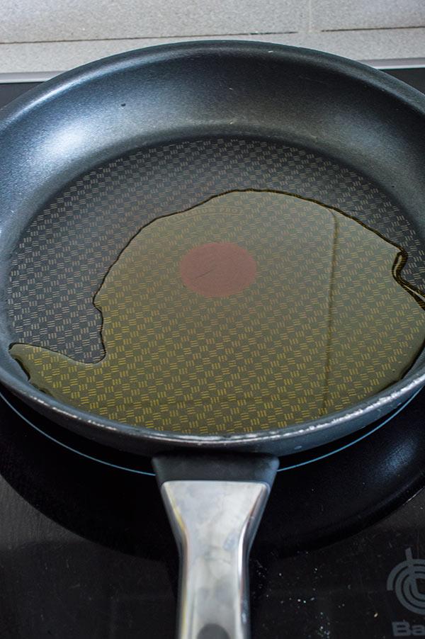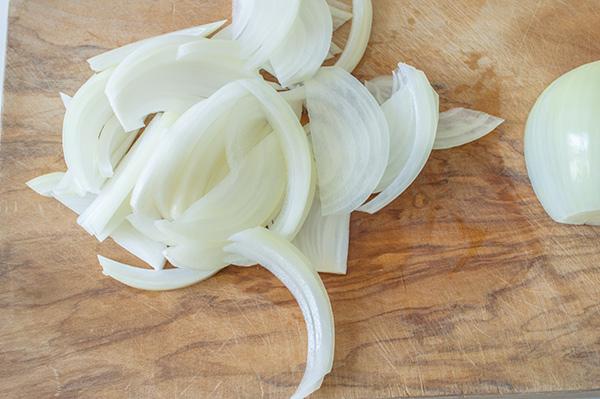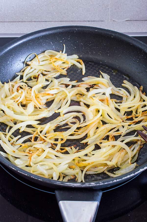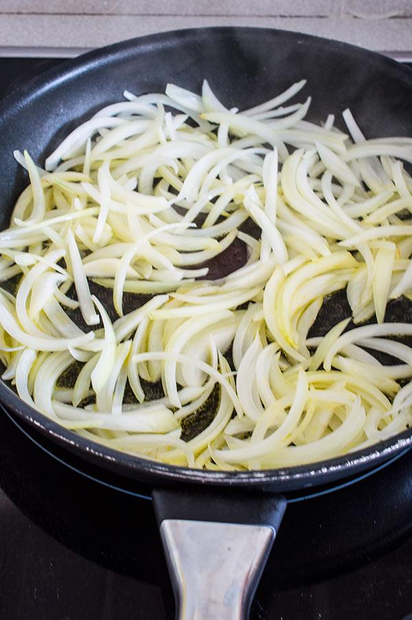 Ponemos un chorrito de aceite en una sartén antiadeherente y sofreímos la cebolla a fuego medio hasta que se ablande y se dore un poco.