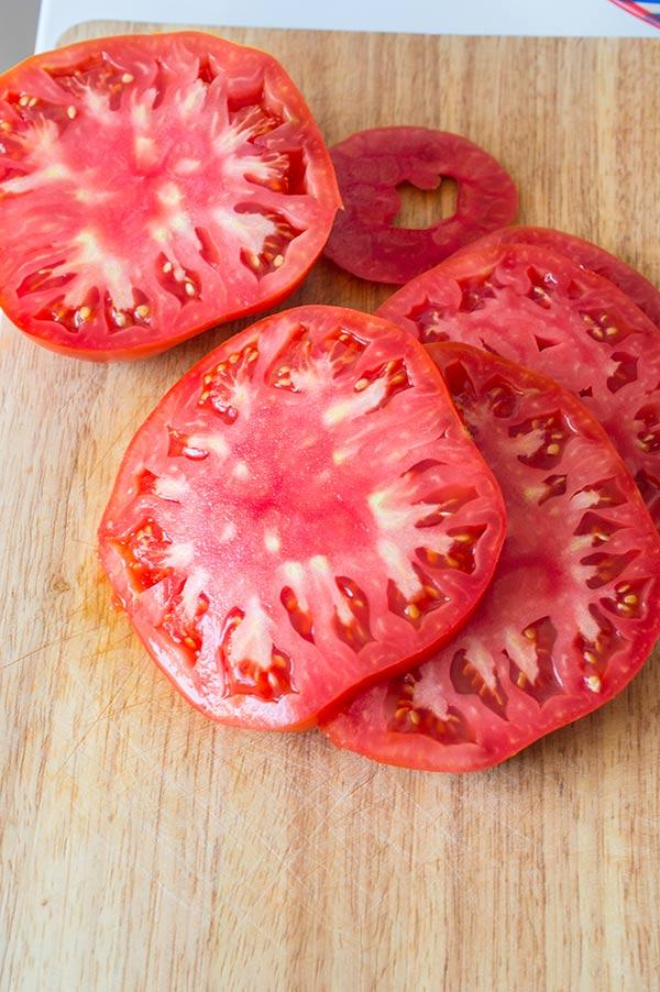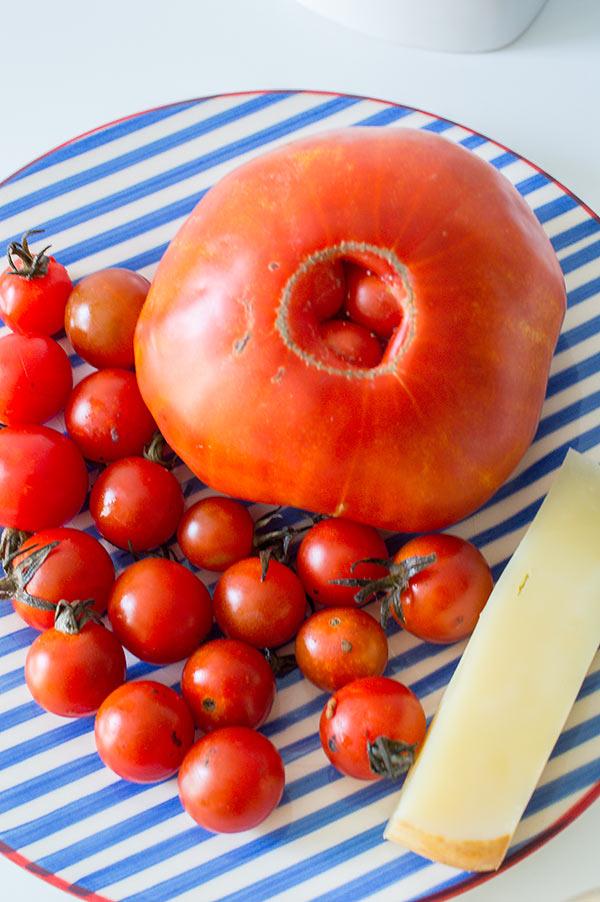 Cortamos el tomate en rodajas de 1/2 cm, así como los tomatitos.