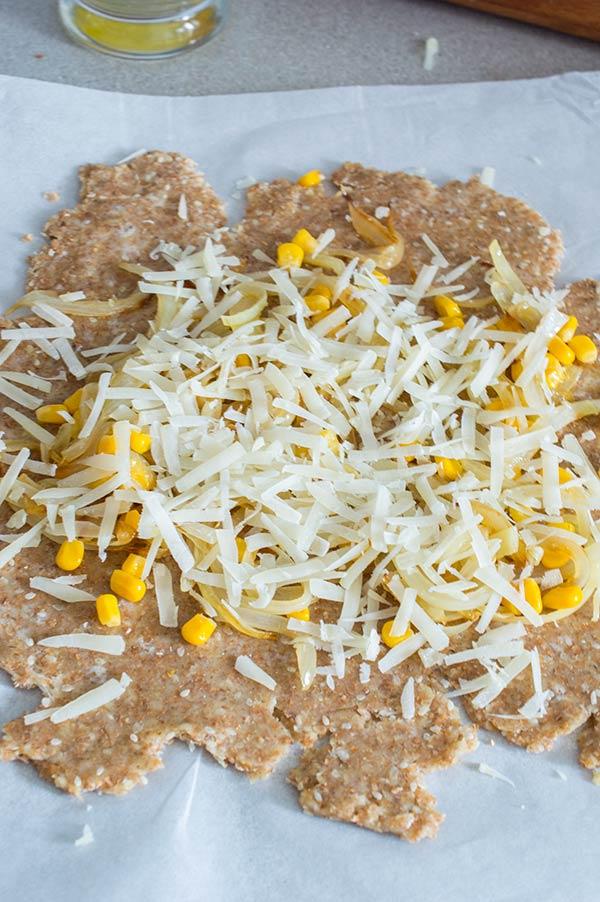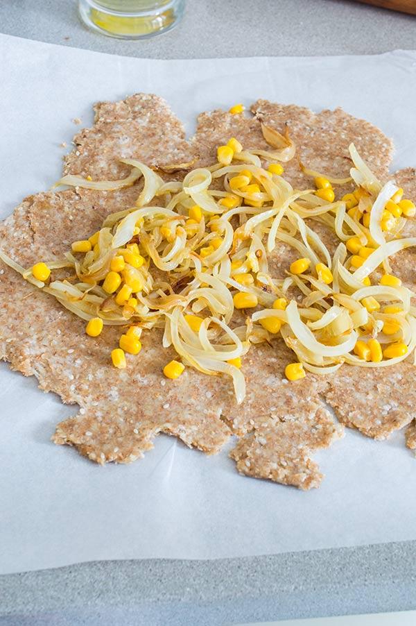 Colocamos el sofrito de cebolla y maíz sobre la masa. Dejamos unos centímetros de borde