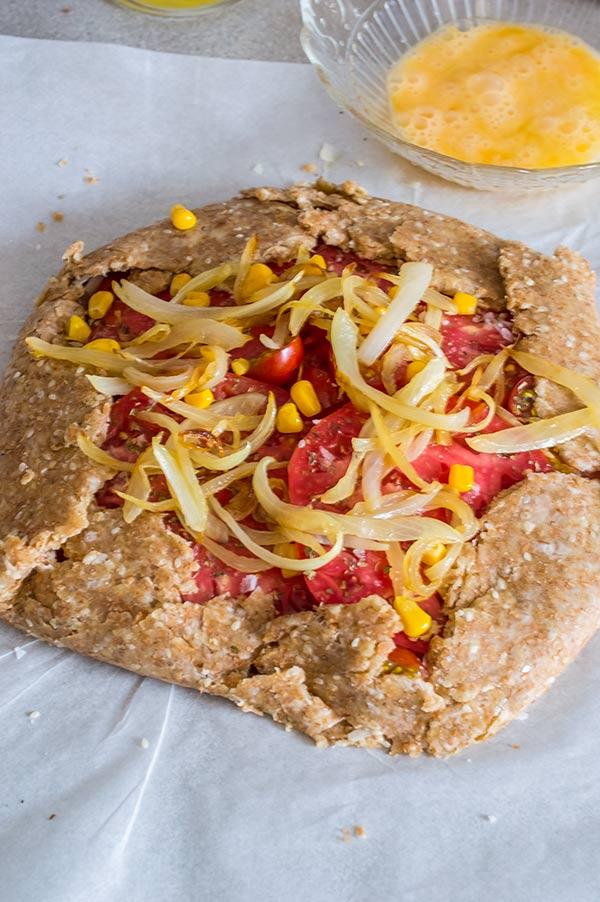 Colocamos encima un poco mas del refrito y cerramos la galette, simplemente doblando los bordes sobre el relleno. Pincelamos con huevo batido los bordes.