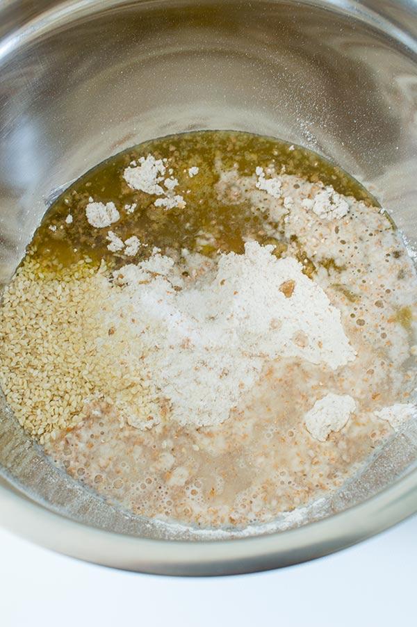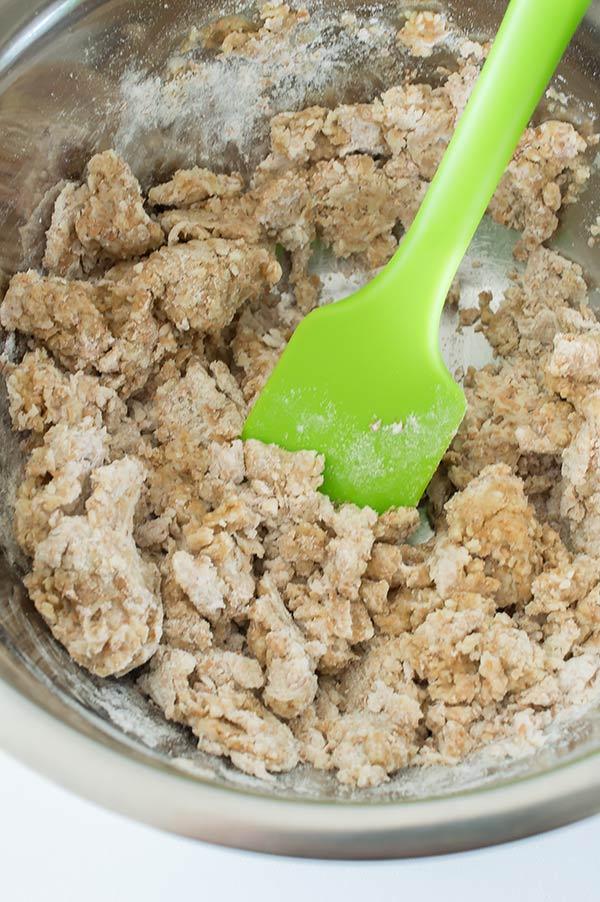 Para empezar ponemos todos ingredientes de la masa en un bol y removemos con una espátula al principio para mezclarlo todo y después con la mano…. esta masa quebrada no hay que amasarla demasiado, simplemente con juntar los ingredientes y hacer una bola, bastaria.