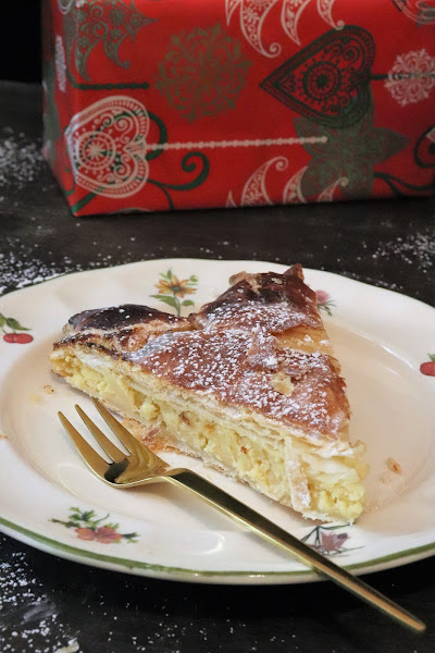 Este pastel hecho con hojaldre está relleno de frangipane que es una crema que se emplea en repostería y que está compuesta de crema de almendras y crema pastelera en mayor o menor proporción. Lo normal es utilizar dos partes de crema de almendras por una parte de crema pastelera.