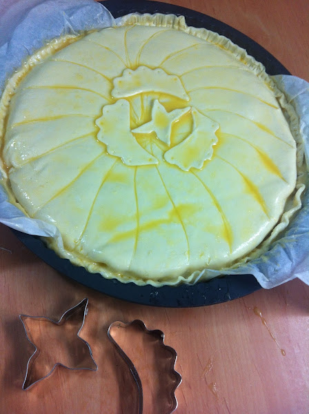 Se rellena con la frangipane (se puede introducir una sorpresa envuelta en papel film) y se coloca la otra lámina de hojaldre por encima.
