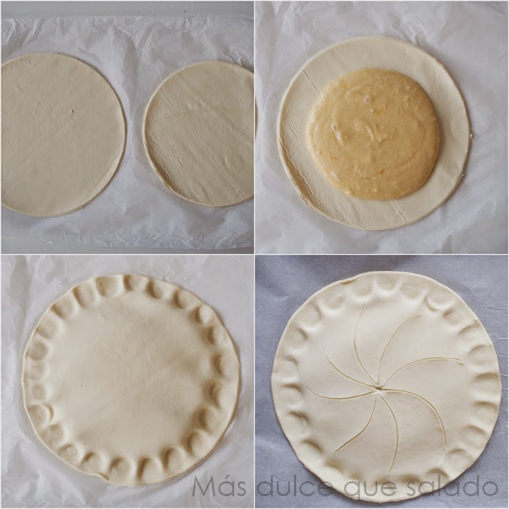 Sí queréis hacer una única gallete tener la precaución de comprar la masa de hojaldre redonda y así no tenéis que andar cortando masa y amasando.