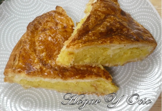 3. Continuamos incorporando la crema al pastel y cerrándolo con otro círculo de masa de hojaldre, procurando sellar bien los bordres para que no se abra al hornear. Hacemos un agujero en el centro de la masa para que salga el aire, y si queremos decorar el dulce, trazamos un dibujo con un cuchillo sin llegar a cortar la masa (suelen realizarse dibujos geométricos).