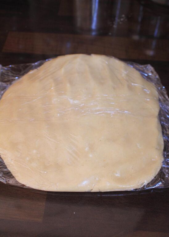 1. Sacamos la masa de la nevera y la ponemos entre dos bolsas de plástico (yo usé las bolsas de congelación abiertas) y extendemos la masa finita con la ayuda de un rodillo. Tendremos que conseguir un círculo de unos 30-35 cm de diámetro.