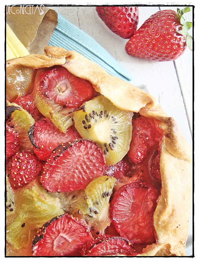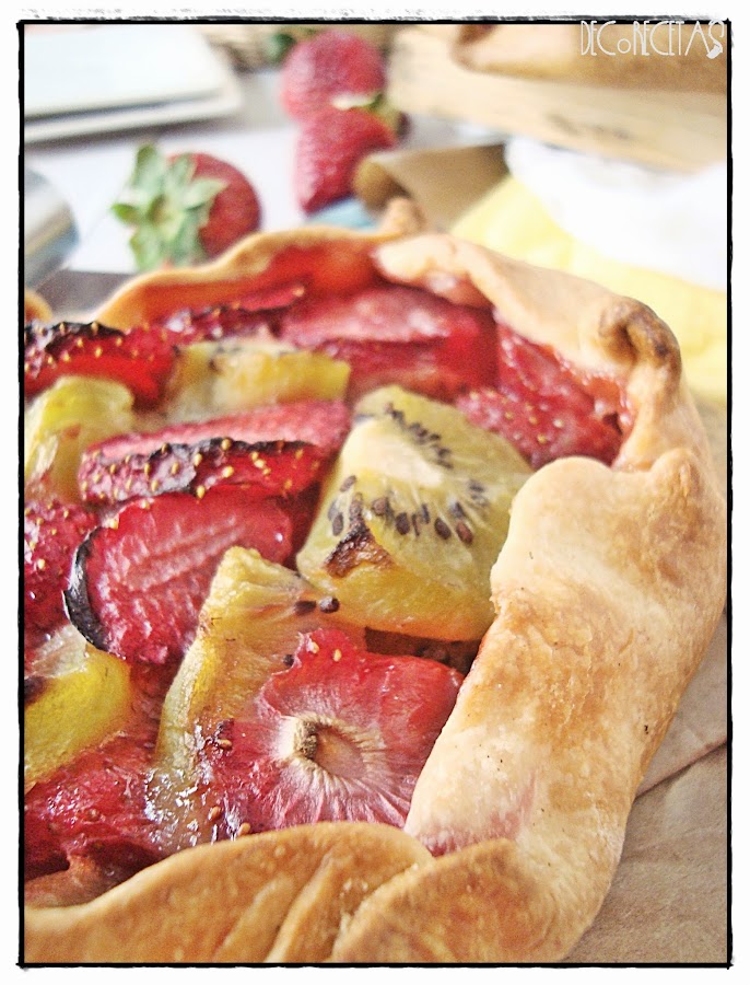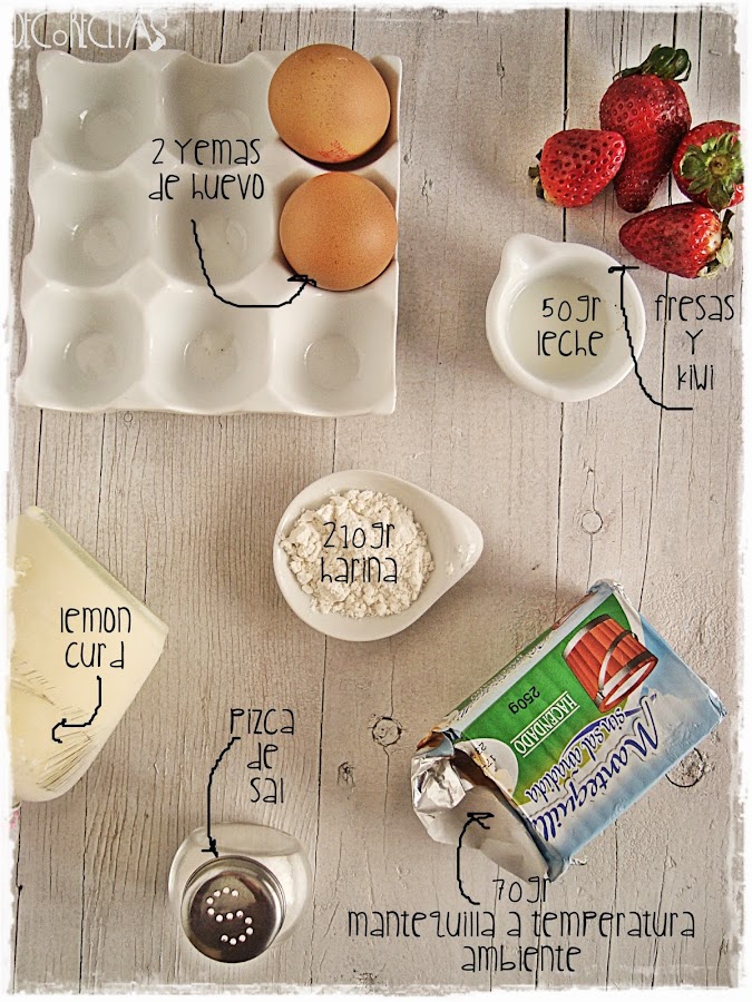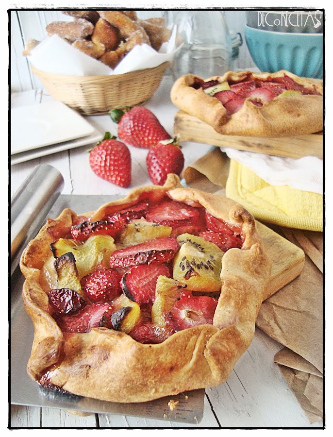 Para montar, simplemente extendemos en el centro de cada Galette, un poco de lemon curd, las frutas cortadas y dispuestas como queramos y cerramos los bordes de la manera que queráis, no tienen porqué quedar perfectos. Meteremos al horno a 180 grados por 20-30 minutos