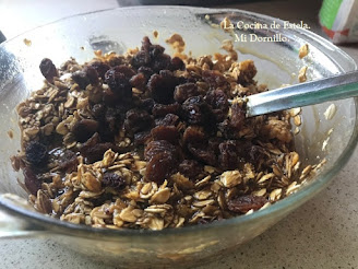 Añadimos los copos de cereales, las pasas, la levadura, sal, y la vainilla. Mezclamos muy bien todo.