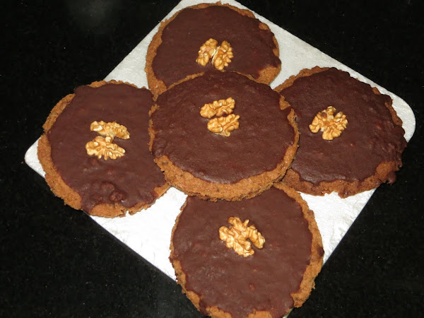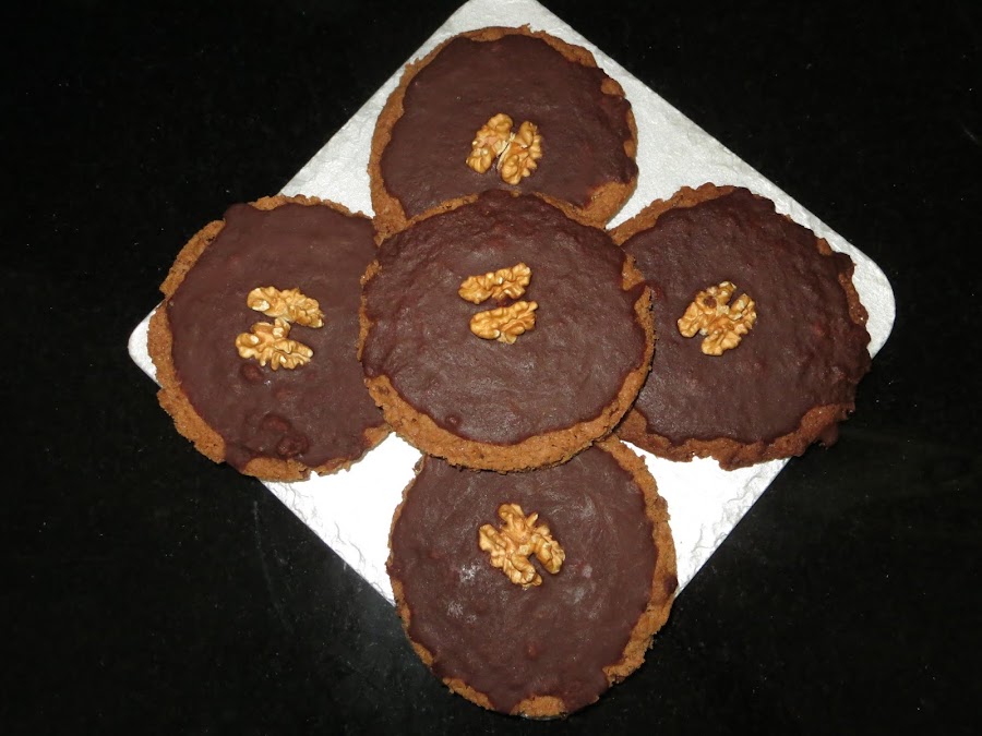 Una vez terminado el tiempo, sacamos y dejamos enfriar en una rejilla, mientras hacemos el glaseado juntando el chocolate negro derretido con la mantequilla, junto con el agua y el azúcar glass. Bañamos las galletas y les colocamos la mitad de una nuez encima.
