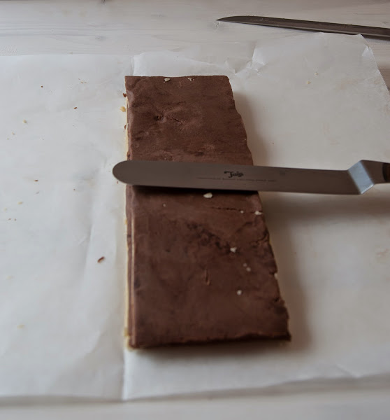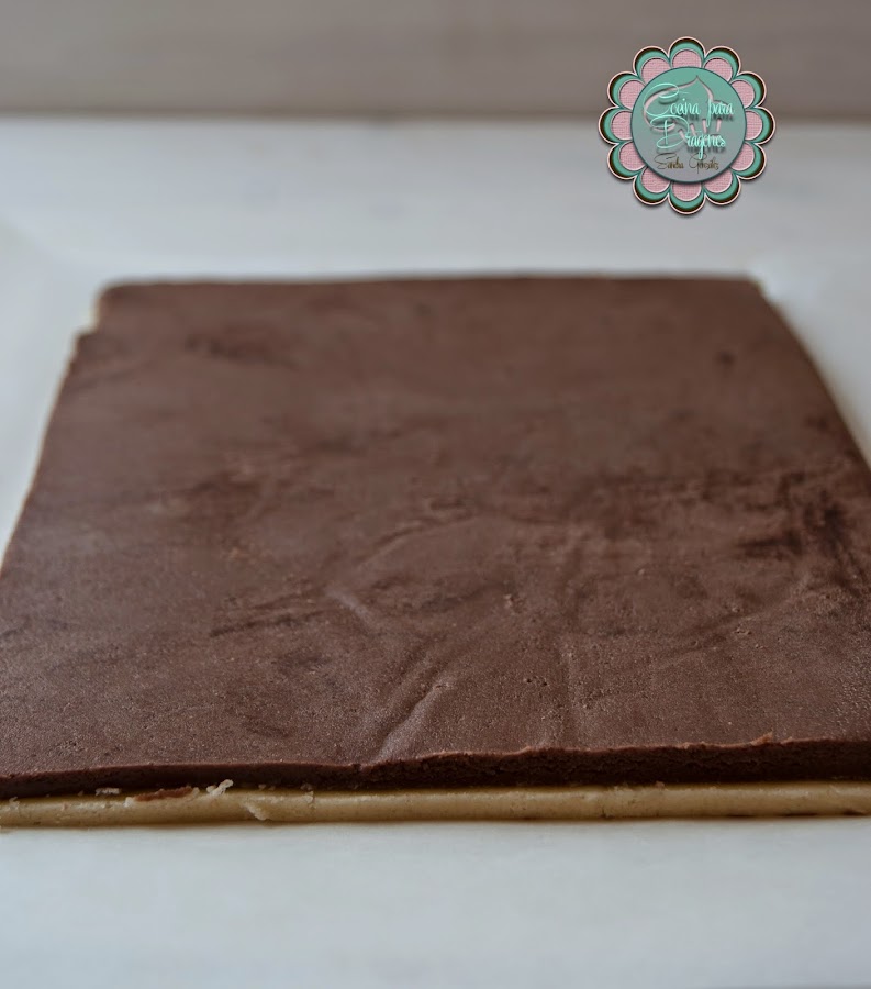 3) estiramos cada masa entre dos papeles de hornear formando un rectángulo con cada uno. Reservamos en la nevera hasta que se endurezcan.