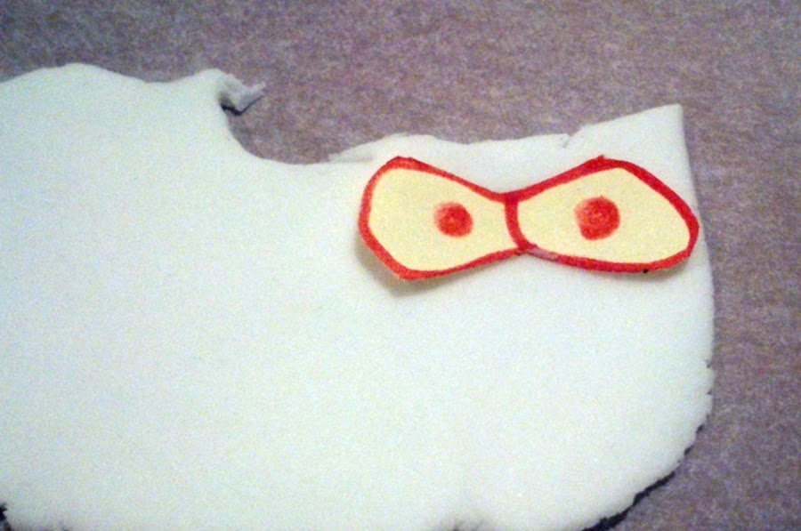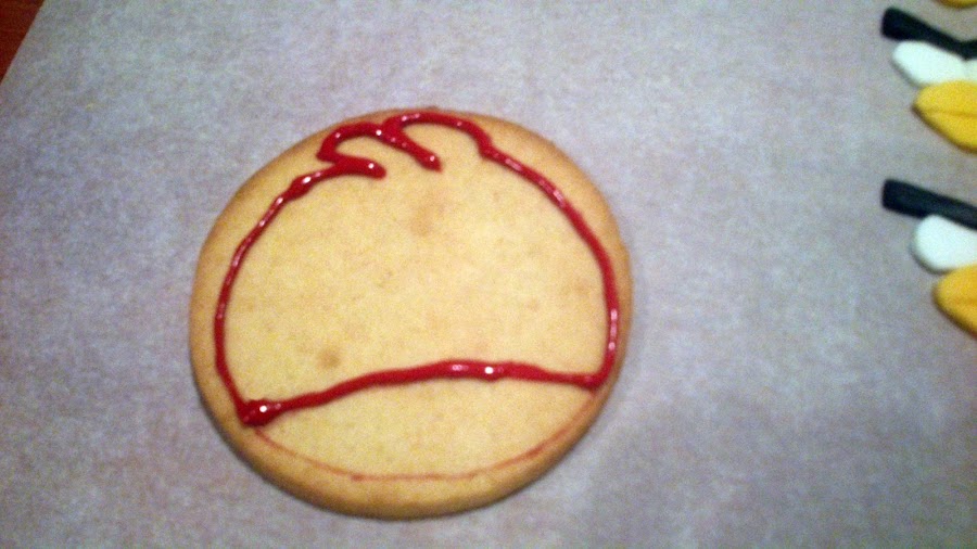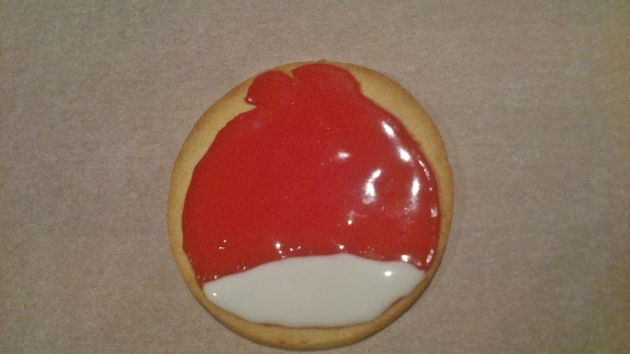 El fondo de la galleta fué con glassa roja y blanca y a medida que ponia la glasa iba añadiendo las piezas de fondant (así al secar quedan pegadas).