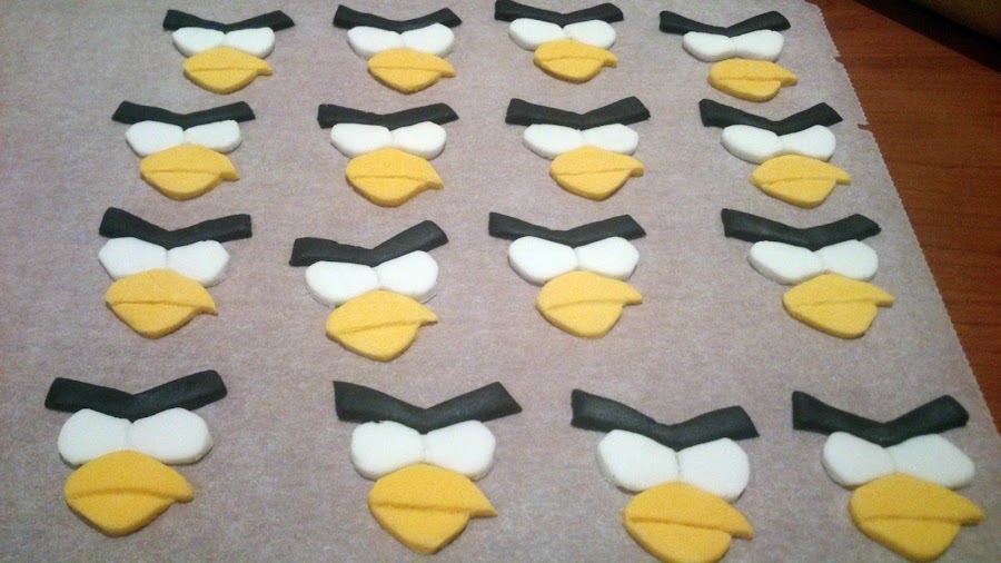 Primero marque todas las galletas con rotulador comestible, reserve y empeze a hacer con fondant las cejas, ojos, picos y colas..... reserve todas las piezas.
