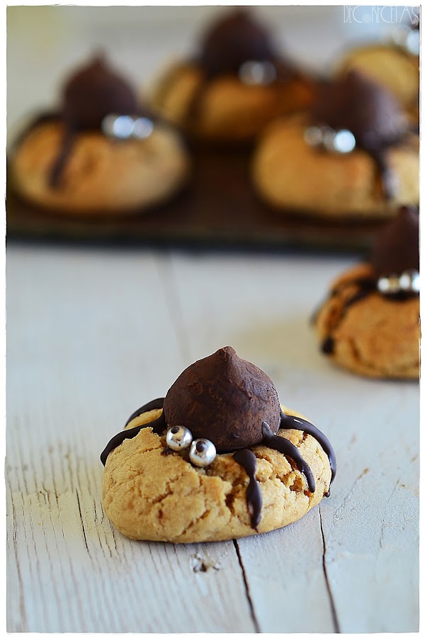 Realizaremos con estas cantidades un total de unas 12 bolitas del mismo tamaño que depositamos en una bandeja de horno separadas entre sí ya que tienden a agrandar en el horneado. metemos al horno precalentado a 180° por 10 minutos, momento en el cual la sacamos del horno y las hundimos con la parte de atrás de un motero o cualquier elemento con la forma redondeada. ese agujerito será donde irá nuestro nuestra trufa de chocolate que será la cabeza de las arañas. volveremos a meter en el horno por otros 10 minutos más punto