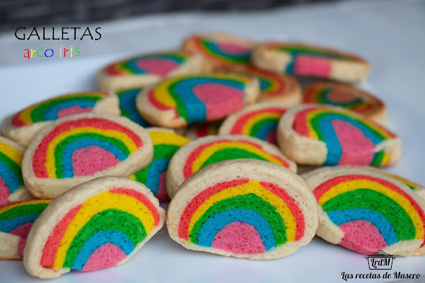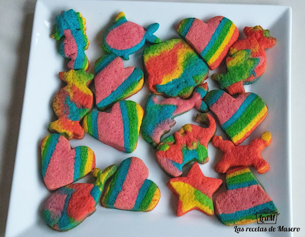 Horneamos a 180º por 8-10 minutos, dependerá de cada horno, tened cuidado de que no se doren mucho sino se arruinará nuestro arcoíris. Dejamos enfriar sobre una rejilla y listas para degustar.