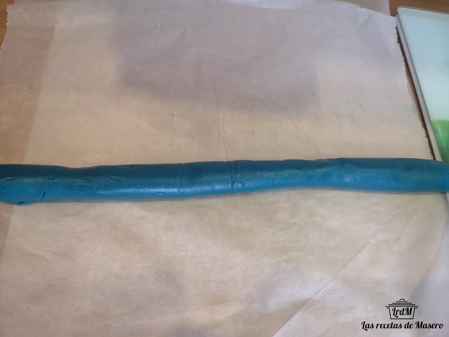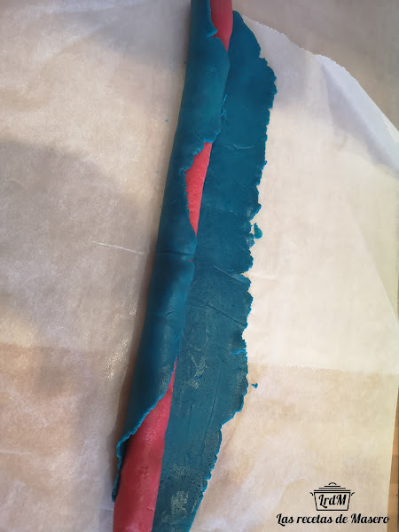 Cada una de las dos mitades la envolvemos en la parte de masa que habíamos dejado sin colorante y volver a meter en la nevera otros veinte minutos.
