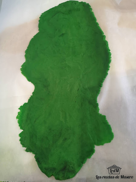 Teñimos todas las porciones y estiramos con un palo de amasar entre dos papeles vegetales. Metemos en la nevera cada porción de masa durante unos 20 minutos.