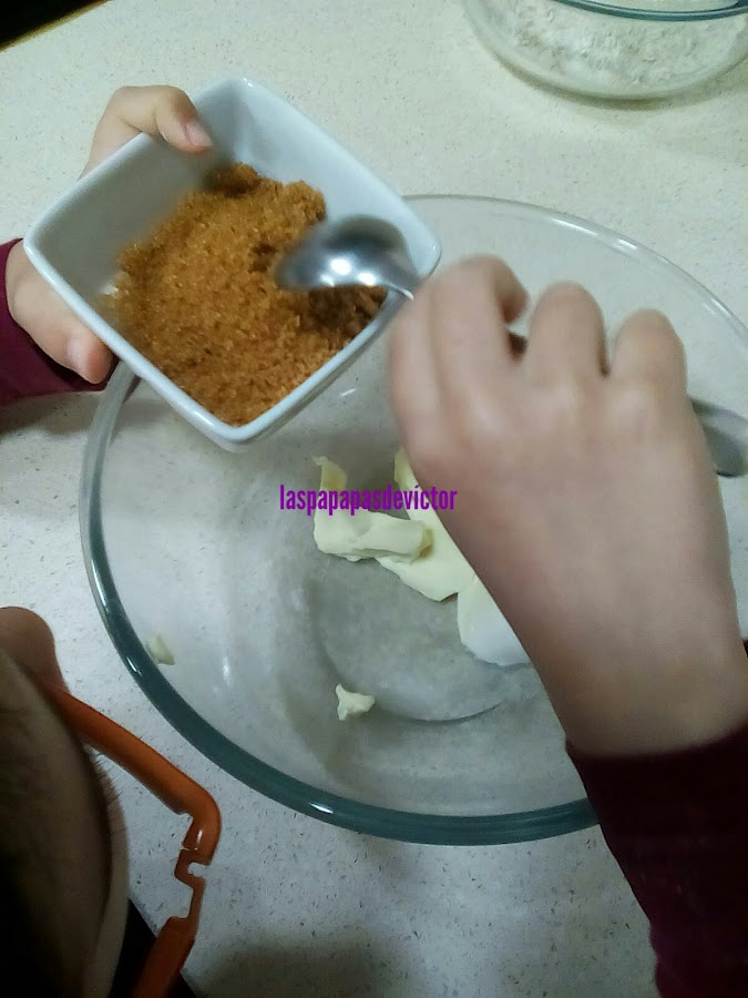 En otro cuenco ponemos la mantequilla pomada y el azúcar moreno y batimos hasta hacer una pasta