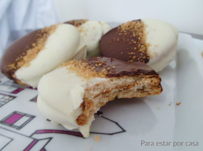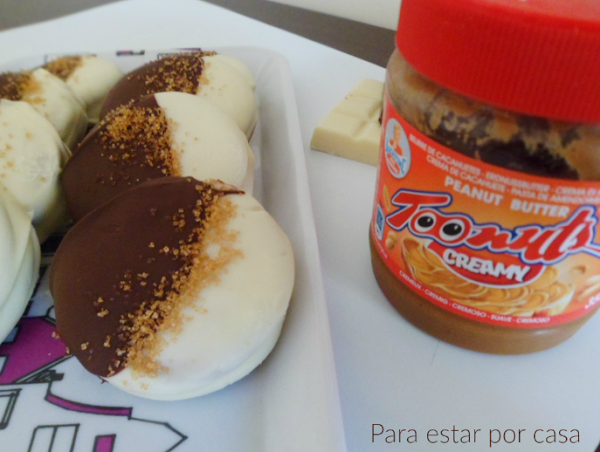 Con las galletas típicas del desayuno, rellenas de crema de cacahuete y cubiertas de chocolate, se preparan esta receta que estoy segura que vas a preparar más de una vez.
