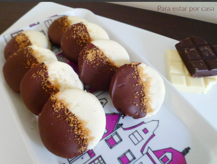 Una vez se ha endurecido el chocolate blanco, bañaremos la otra mitad de cada galleta con chocolate negro y, antes de que éste se endurezca, le pondremos un poco de azúcar moreno por encima.