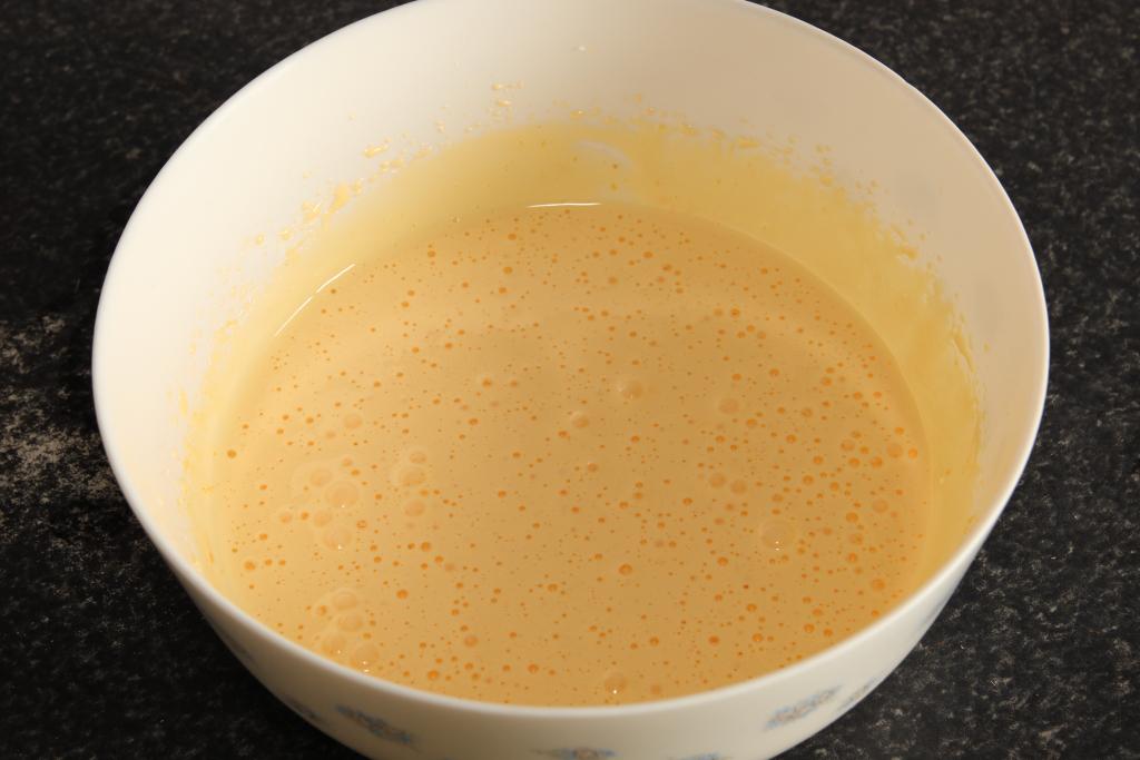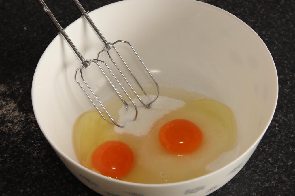 En un bol amplio batimos los huevos y el azúcar con las varillas eléctricas hasta que blanqueen y tripliquen su volumen.