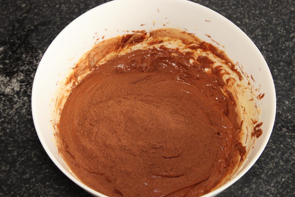 Añadimos la mezcla del chocolate tibio y seguimos batiendo hasta que se mezcle bien. Echamos el cacao y la sal tamizados y seguimos batiendo hasta que resulte una masa suave, brillante y espesa.