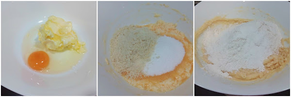 Mezclamos la mantequilla en pomada con el huevo. Una vez hecho, incorporamos la almendra y el azúcar y finalmente la harina mezclada con la levadura hasta integrarlos completamente.