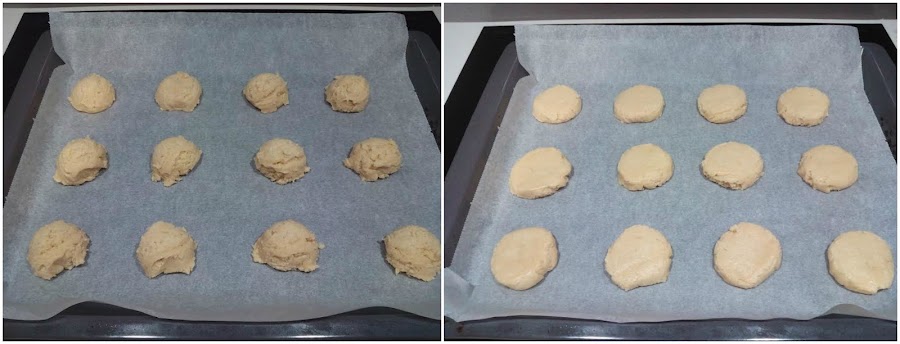 Ponemos papel sulfurizado en una bandeja de horno y con ayuda de una cuchara de helado, vamos poniendo bolas de masa dejando espacio entre ellas. Aplastamos un poco con la palma de la mano y horneamos a 190º unos 12 minutos (o hasta que queden bien doradas).