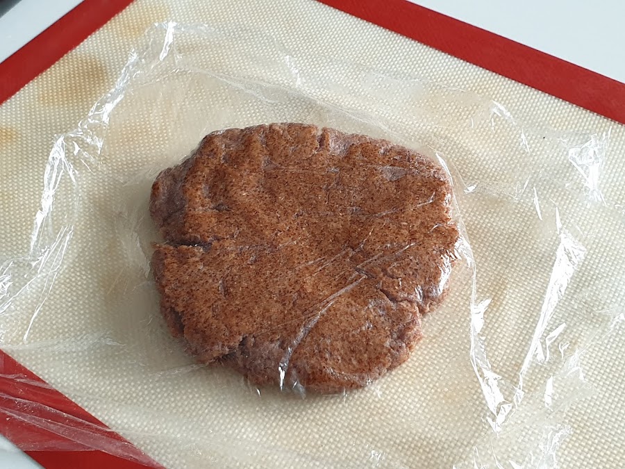 4. - Ponemos la masa en la encimera, y sin amasar más, le ponemos film por encima y extendemos con un rodillo hasta que esté de unos 2 milímetros de altura.
