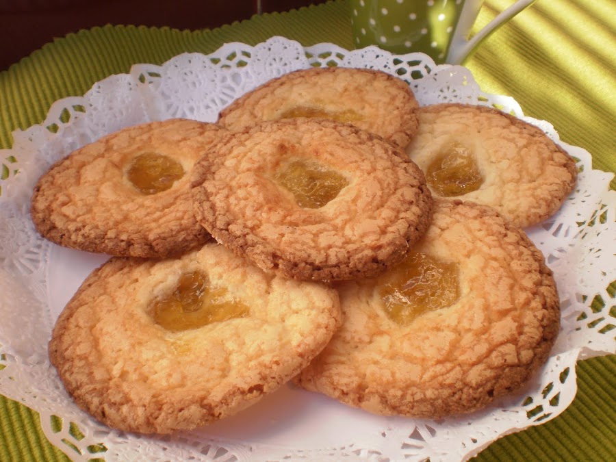 Hacer un hueco en el centro de cada galleta (lo hice con el dedo humedecido) y rellenarlo con mermelada (puse de albaricoque, aunque en la receta original era de lima, producto propio de las zonas caribeñas, pero no tenía en “Mi cocina” dicha mermelada).