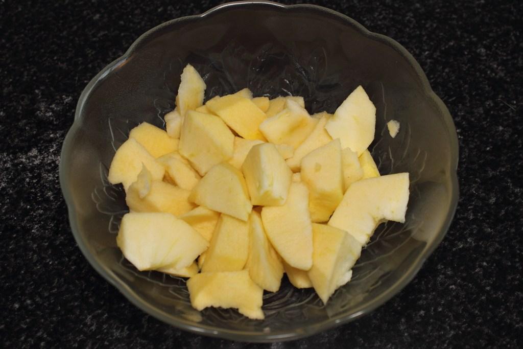 Pelamos, descorazonamos y picamos menuda la manzana, la ponemos en un bol y la cocemos en el microondas hasta que veamos que está blanda. Las machacamos con un tenedor y reservamos.