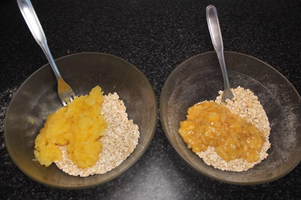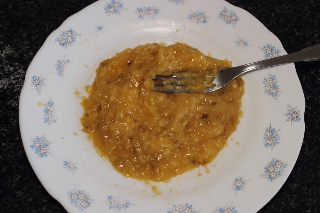 Picamos las almendras y reservamos. Pelamos el plátano, lo trituramos con un tenedor y reservamos.