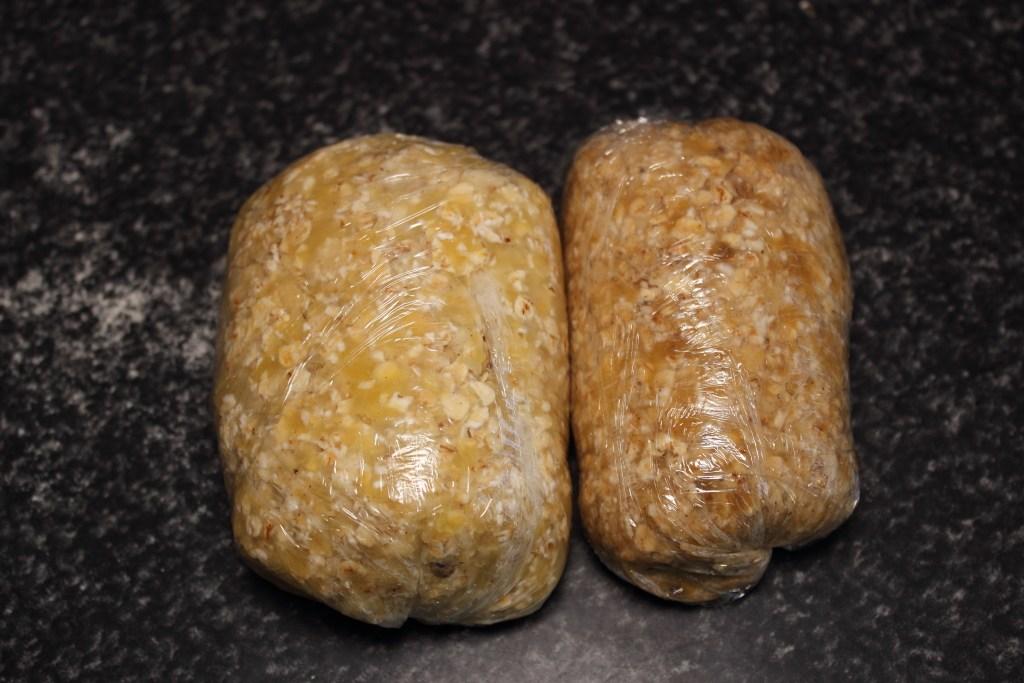 Dividimos en dos éstos ingredientes y una parte la mezclamos con el puré de plátano y la otra con el de manzana. Mezclamos bien por separado para hacer galletas de dos sabores. Hacemos una bola con cada masa y envolvemos las masas por separado en film transparente, las llevamos a la nevera hasta el momento de formar las galletas.