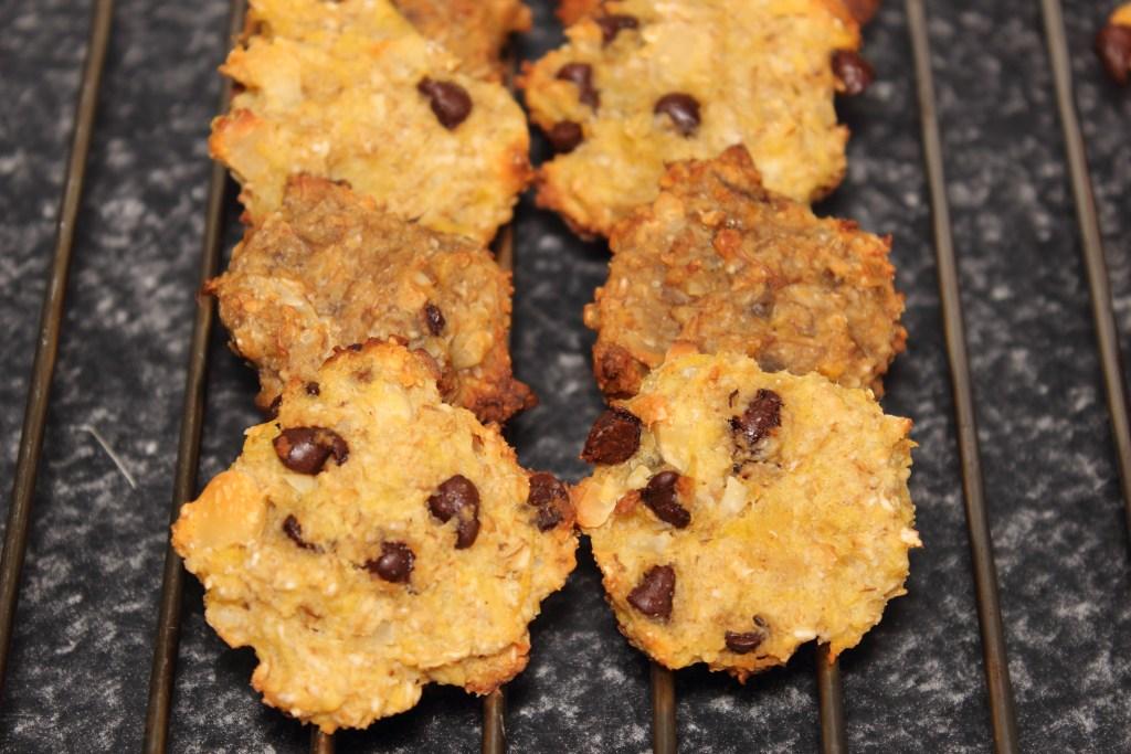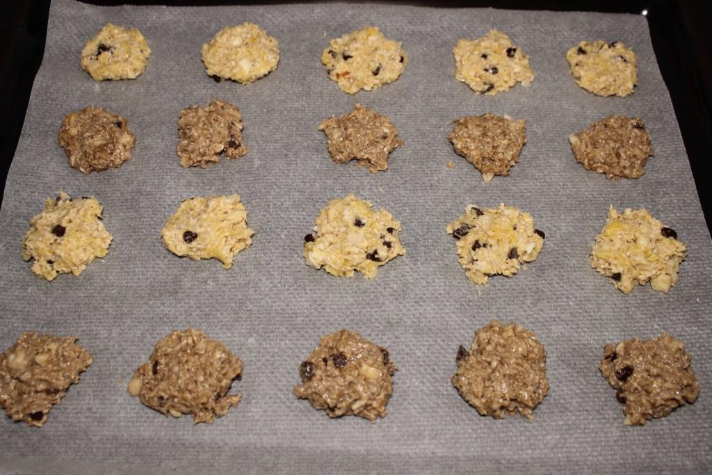 Sacamos la masa de la nevera. Si vemos que queda blanda, rectificamos con copos de avena y si vemos que queda seca, añadimos más fruta. Echamos el jengibre en cada masa (opcional) y las pepitas de chocolate. Hacemos bolitas con las manos, las disponemos sobre la bandeja de horno forrada, aplastándolas un poco con los dedos y las llevamos al horno durante 10 minutos, hasta que estén duras y doradas.