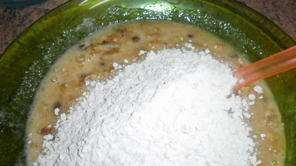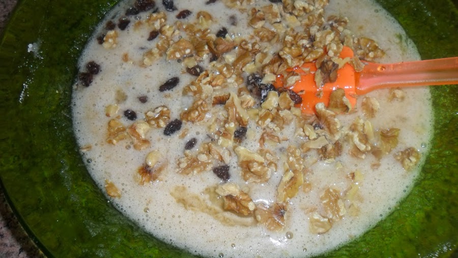 Aparte, poner en un bol, el azúcar, mantequilla a temperatura ambiente, vainilla líquida y miel. Batir hasta integrar con una varillas. Agregar las nueces y pasas sin pepitas y pizca de sal.