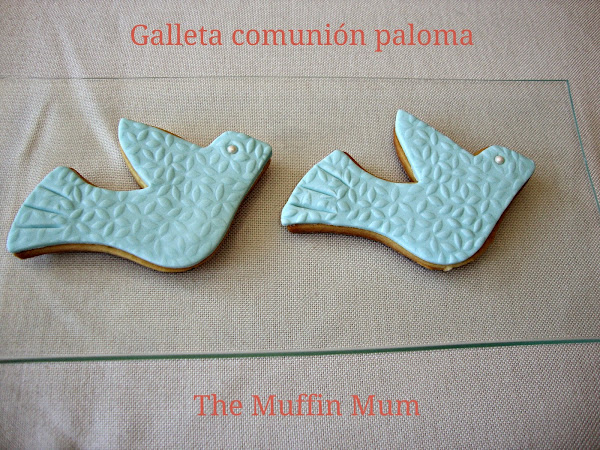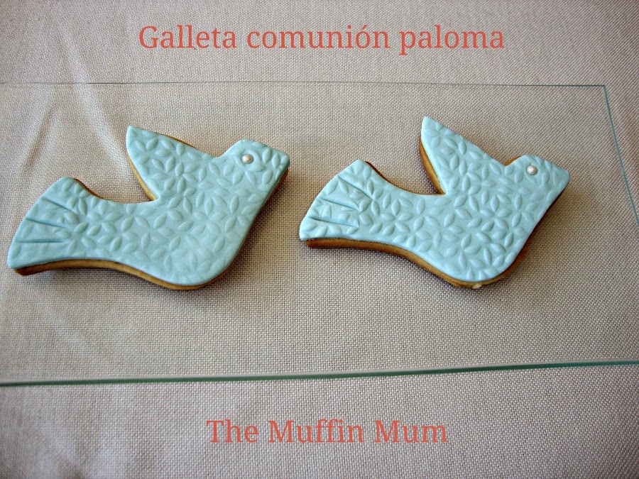 Este modelo es una paloma que en la que hemos pasado un texturizador por el fondant y a modo de ojo lleva una perlita de anís.