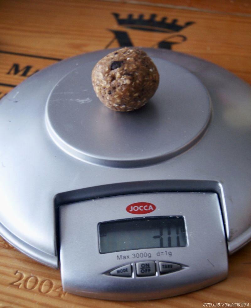 4. Sacamos nuestra mezcla del frío y sobre unas bandejas con papel de horno, con ayuda de una cuchara de café, hacemos unas bolas pequeñas de 30 gramos aproximadamente y disponemos sobre el papel de horno, presionando ligeramente por encima y con separación de al menos 3 centímetros entre cada bolita.